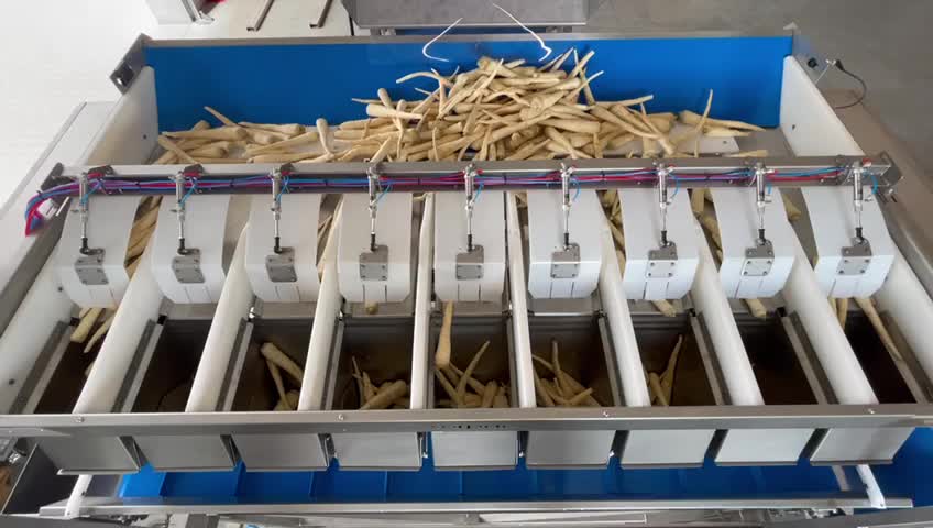MW925 is a combination scales. It is used for weighing and portioning vegetables. Its function is based on assembling a given portion of a product from several smaller portions.This method is very precise, which is crucial for weighing small portions. There are 9 channels used in this type of machine, which gives it high efficiency. The use of the machine is very easy and intuitive thanks to the touchpad and the software created by SORPAC.