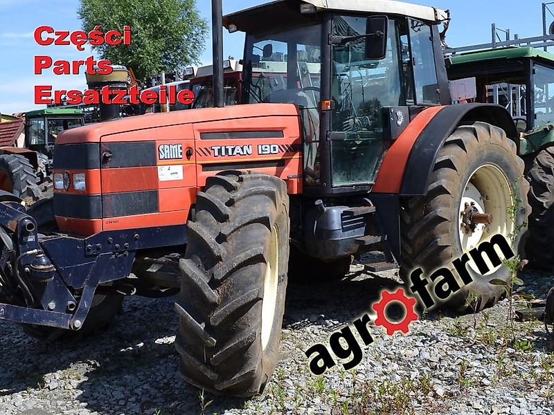 Tractor Same Titan 190 dismantled for parts: Final drive, planetary drive, swivel, knuckle housing, hub, differential, bevel drive, brake, halfshaft, satelite, gearbox, transmission, gear, shaft, hitch, arm, hydraulic cylinder, valve, electronic box, wheel, rim, engine, crankshaft, engine head, cab, drum, synchronizer, clutch, disc, cover, plate, radiator, cylinder block, front axle, frame, lift arm.